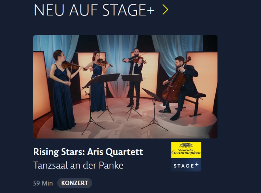 Zu den Auftrittsorten der Musiker zählen Säle wie die Londoner Wigmore Hall, die Elbphilharmonie Hamburg, die Philharmonie de Paris oder das Konzerthaus Wien. Und häufig ist das Aris Quartett gefragter Partner von Solisten, darunter Christiane Karg, Daniel Müller-Schott, Eckart Runge, Kit Armstrong, William Youn und Nils Mönkemeyer.